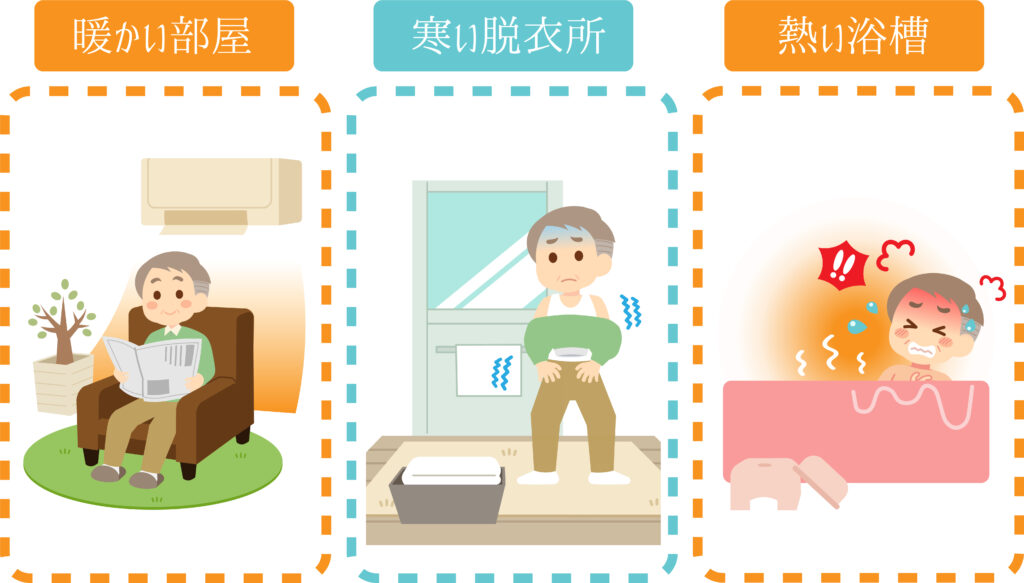 ヒートショック現象とは、急激な温度変化によって血圧が乱高下し脈拍が変動する現象です。