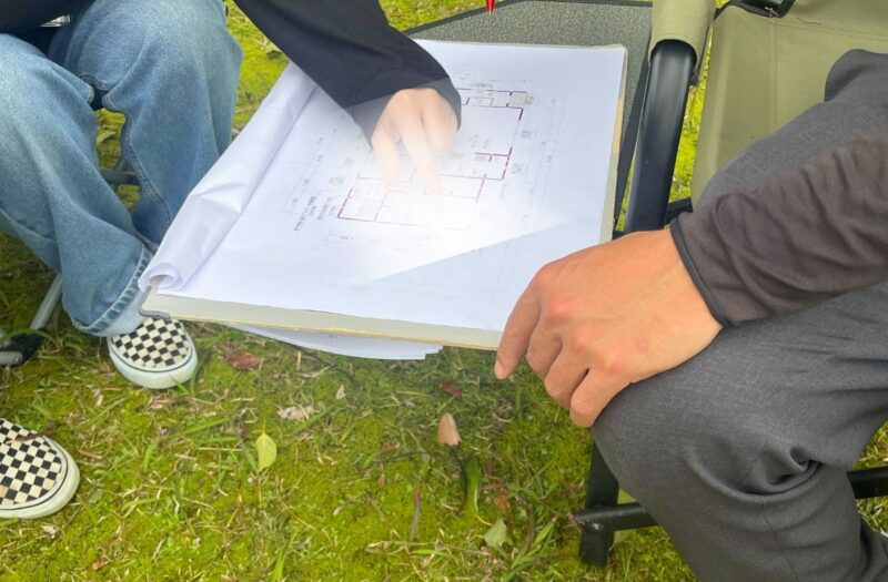 小雨の中の屋外プラン打合せ|土地で感じる暮らし
