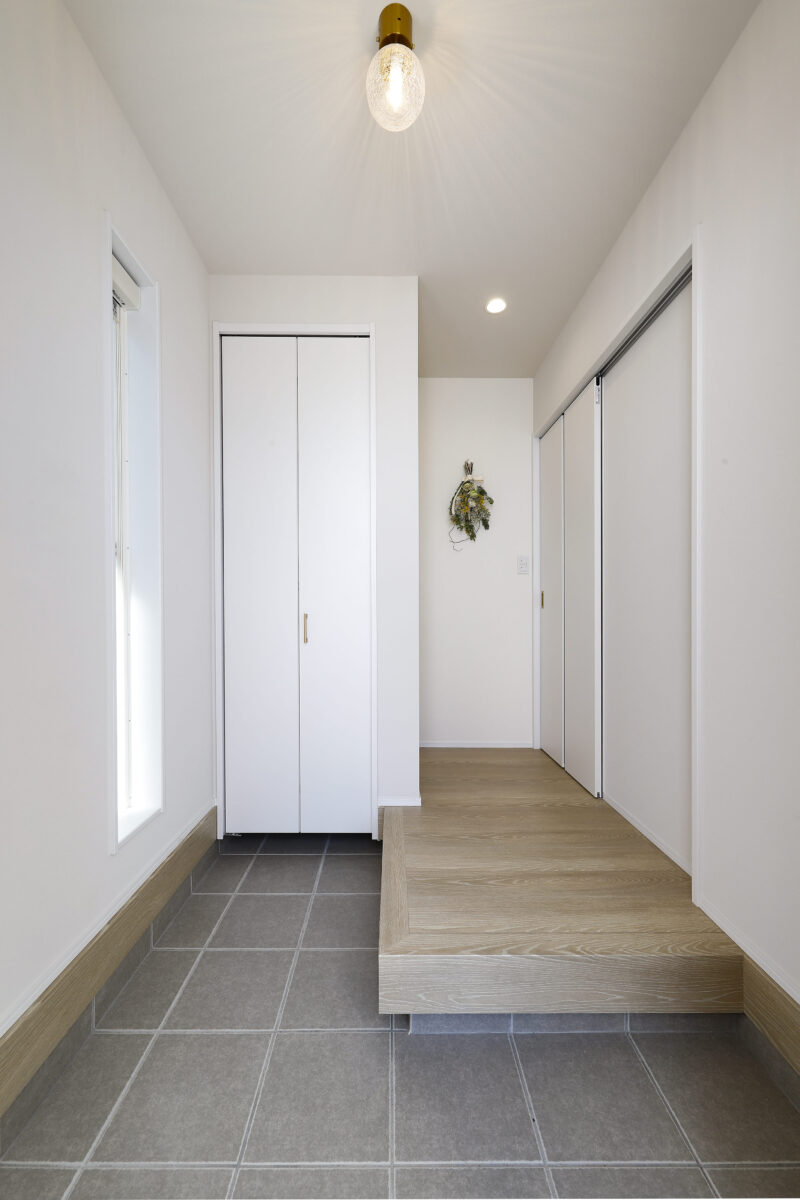 白と木目のやさしい外観に、グレーやベージュのかわいいタイルがアクセント。