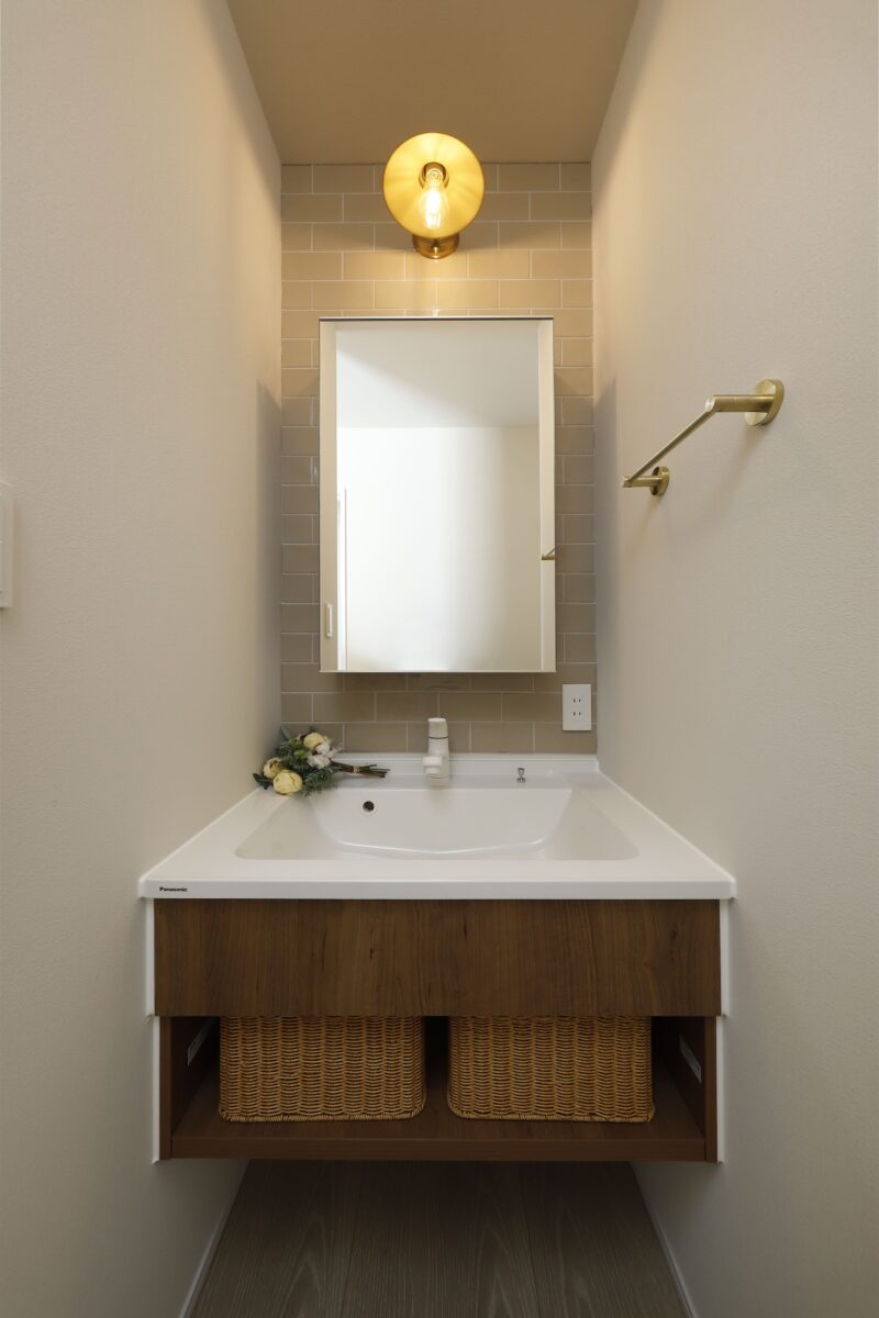 グレーやベージュのタイルが、落ち着きの中にかわいらしさを添えるアクセント。毎日見るたび気分も明るくなります。