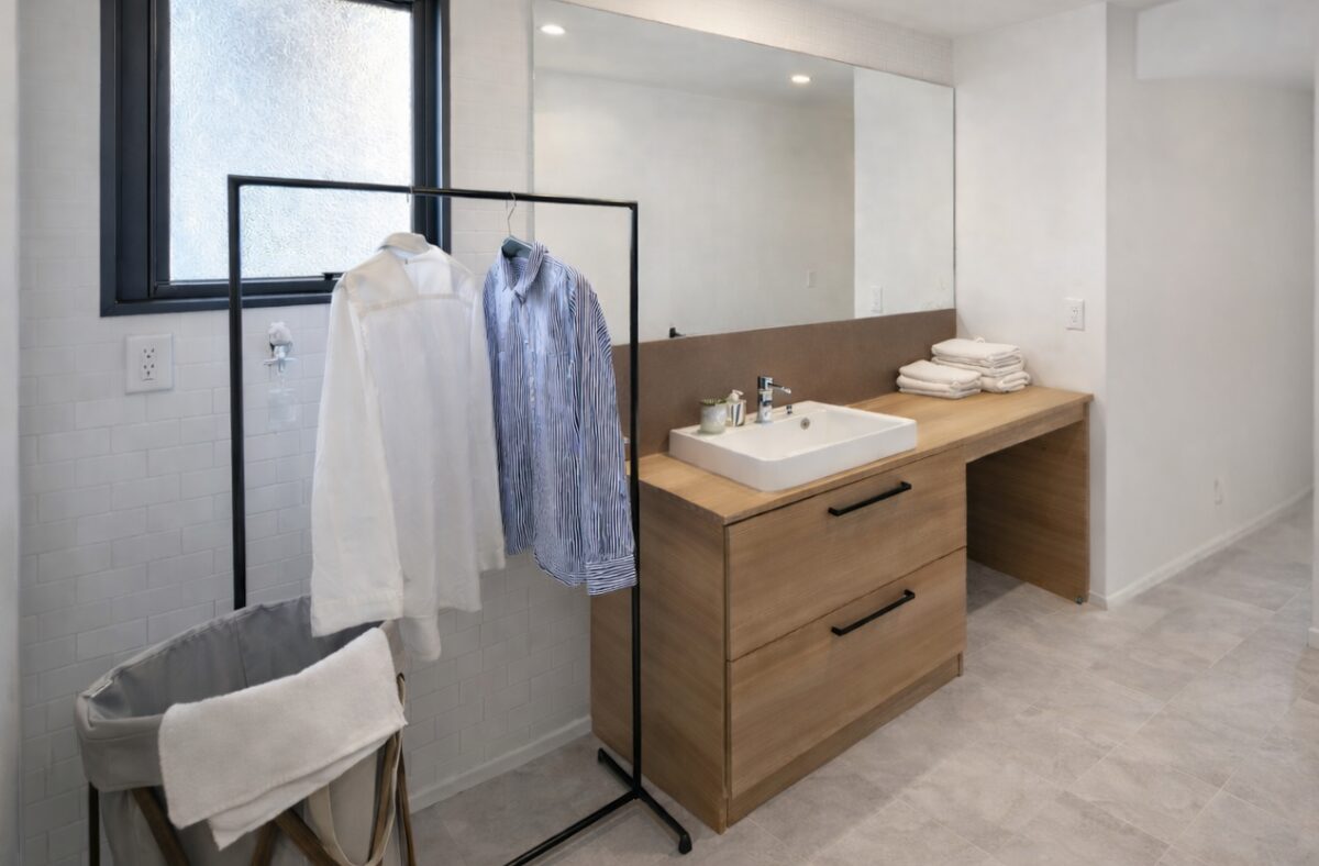 ドライルームも兼ねた洗面脱衣室で、家族の毎日がもっとラクに、もっと心地よく