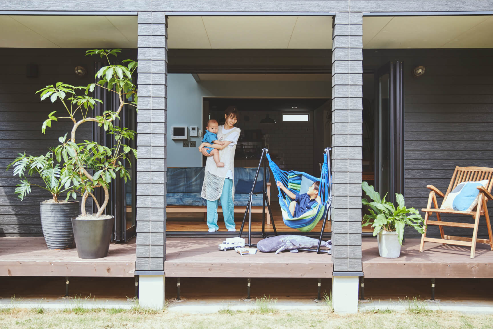 大開口の窓からタイルデッキへと続く開放的なリビングや、2階の広々バルコニーで叶う“おうちアウトドア”。外観はスタイリッシュで存在感抜群、さらに玄関からシューズクローク~ファミリークローク~脱衣室へと続く便利なお帰り動線も実現しました。