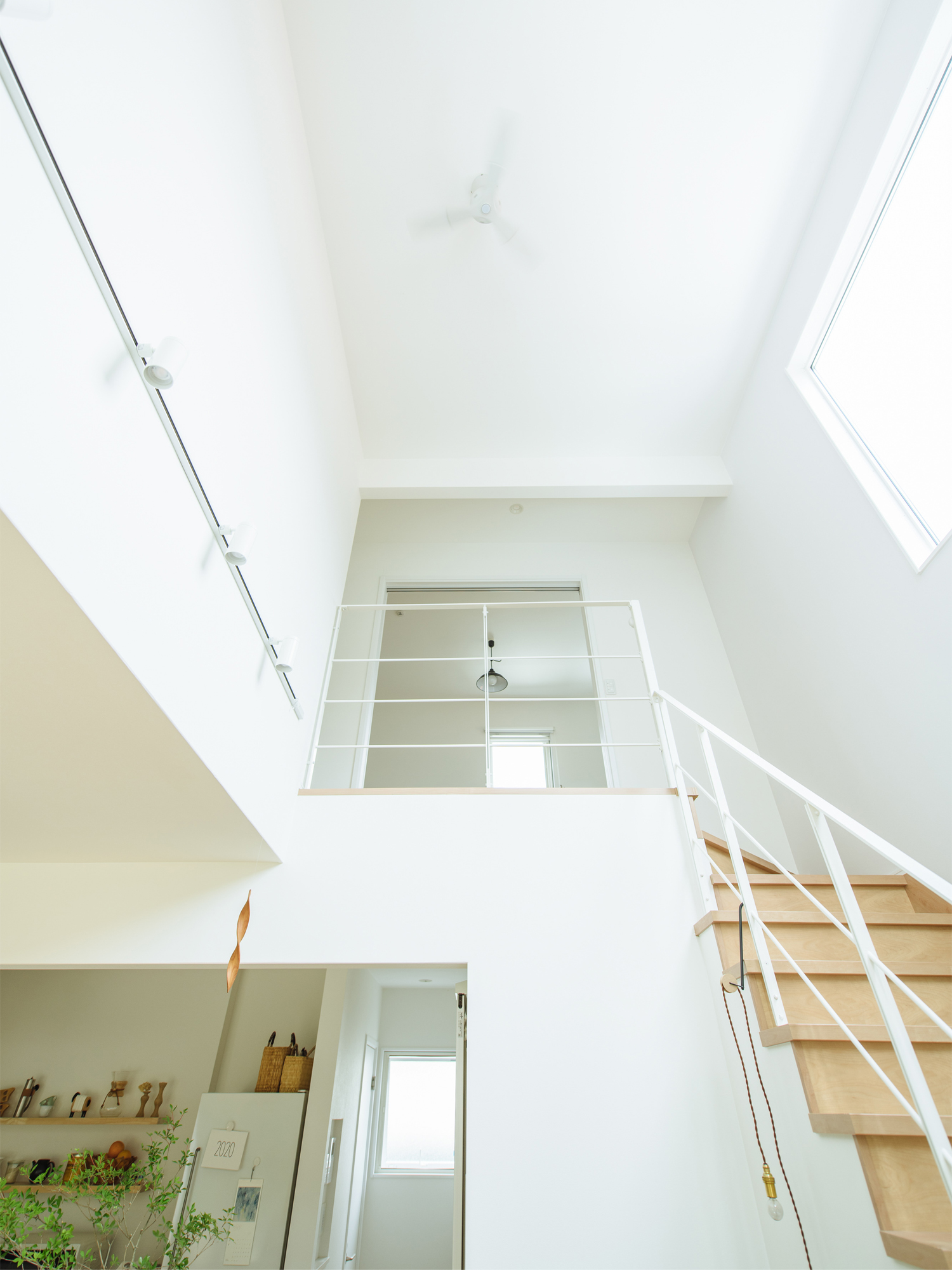 リビングの中心に設けた大きな吹き抜けが、光と風を家全体に届けます。家族の存在を感じながら過ごせるので、自然と会話や笑顔が増える空間に。広さだけでなく、開放感と心地よさを両立したデザインです。