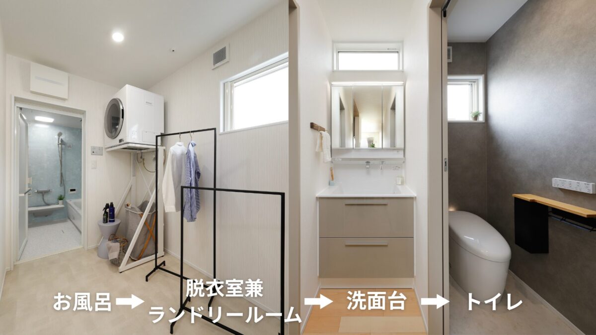 脱衣→洗濯→室内干し→収納→洗面→トイレまで、ムダな動きが一切ない理想の水まわり動線です。「よく動く場所こそ、近くにまとめる」――家事負担をぐっと減らす間取りがここにあります。