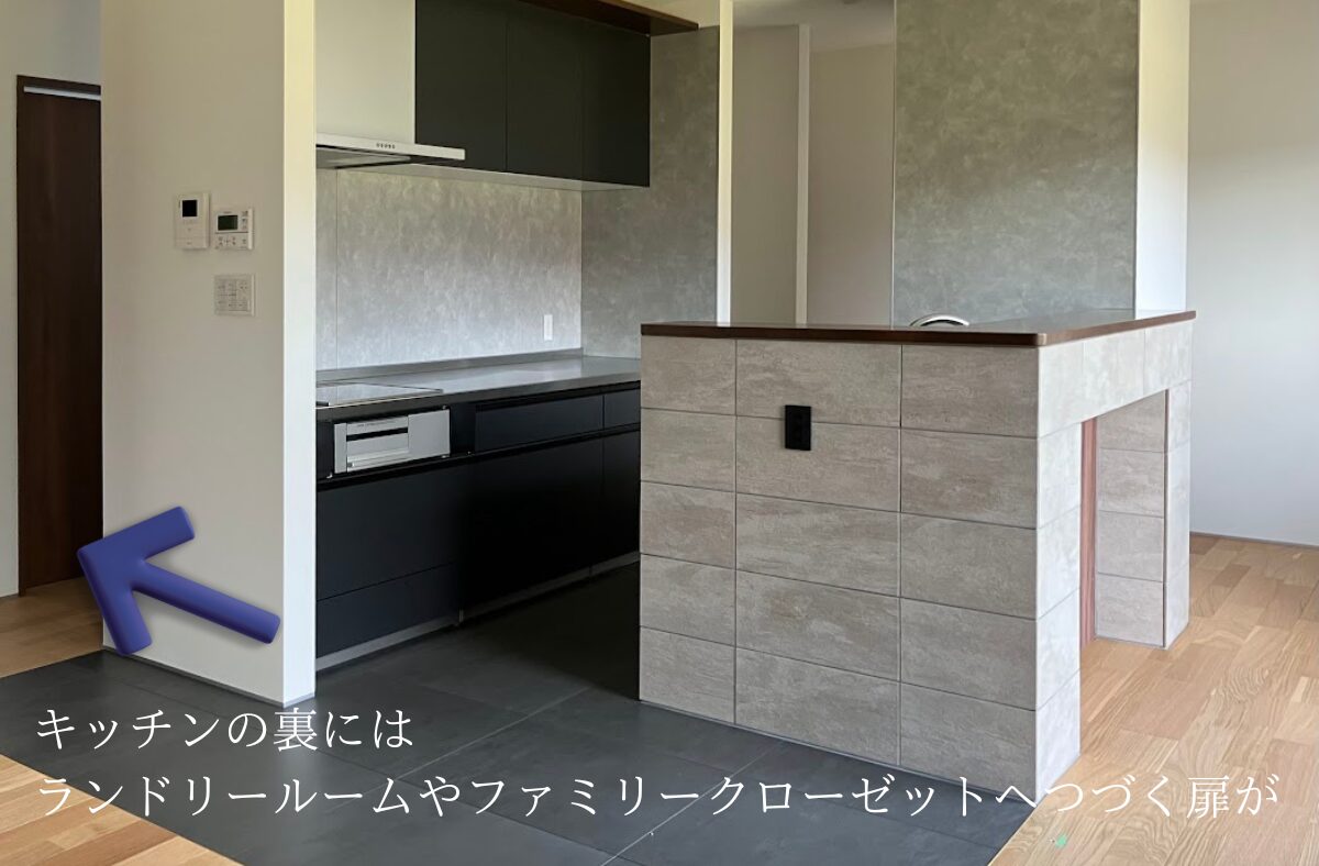 キッチンから直接ランドリールームやファミリークローゼットにアクセスできる、効率的な間取り。料理や洗濯が同時に進む、共働き世帯に嬉しい動線です。