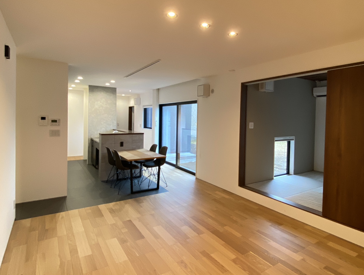 22帖のLDKにタイル床を採用した高級感ある空間。
