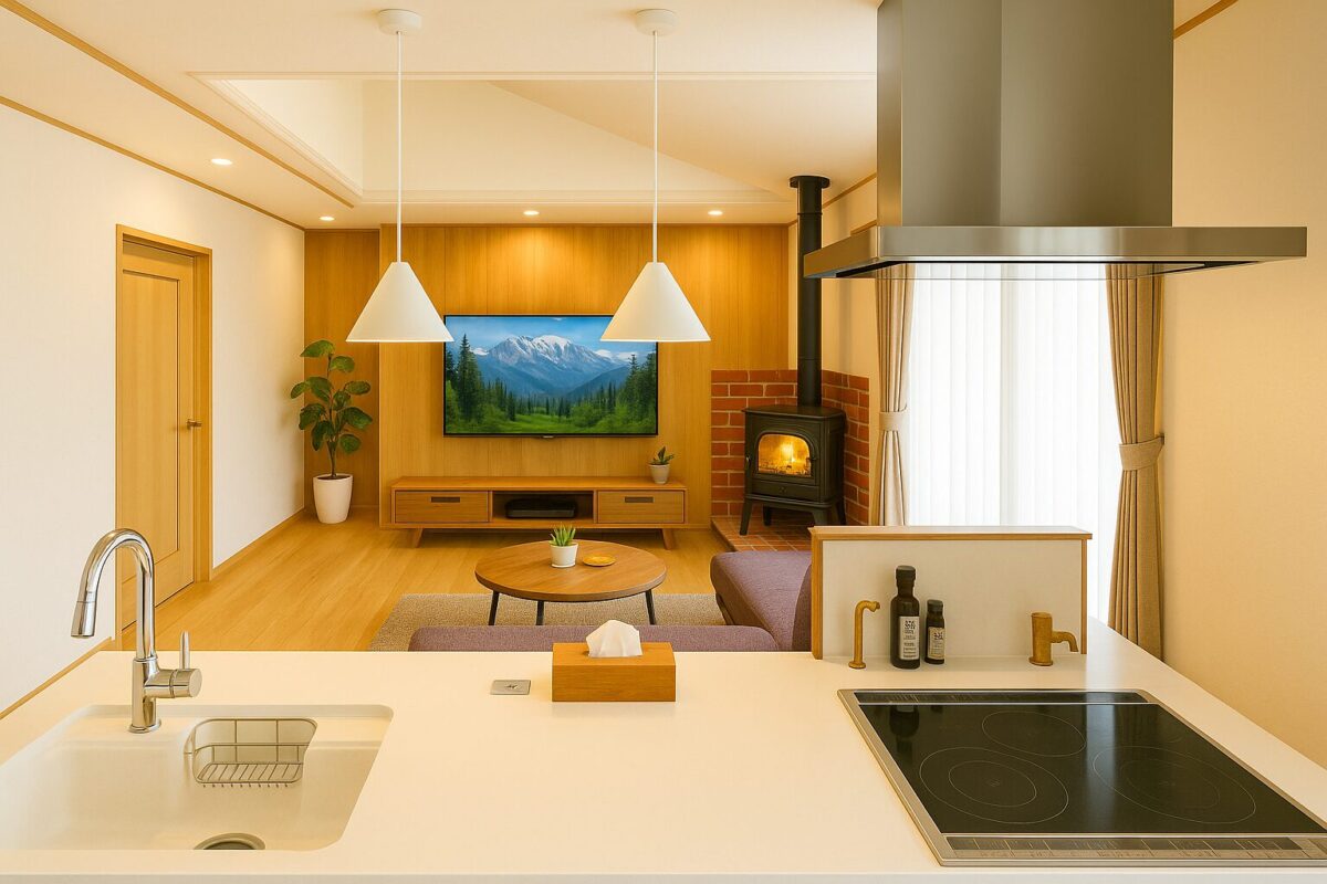 2:炎のぬくもりに包まれる、薪ストーブのあるリビング