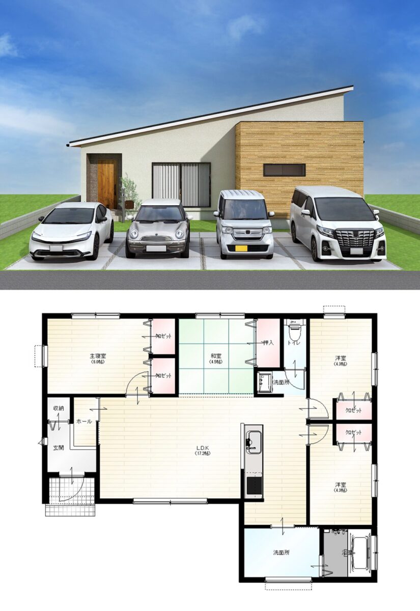 開放感のある勾配天井のLDKから和室までつながり、家族でゆったりできる暮らしやすい平屋です。