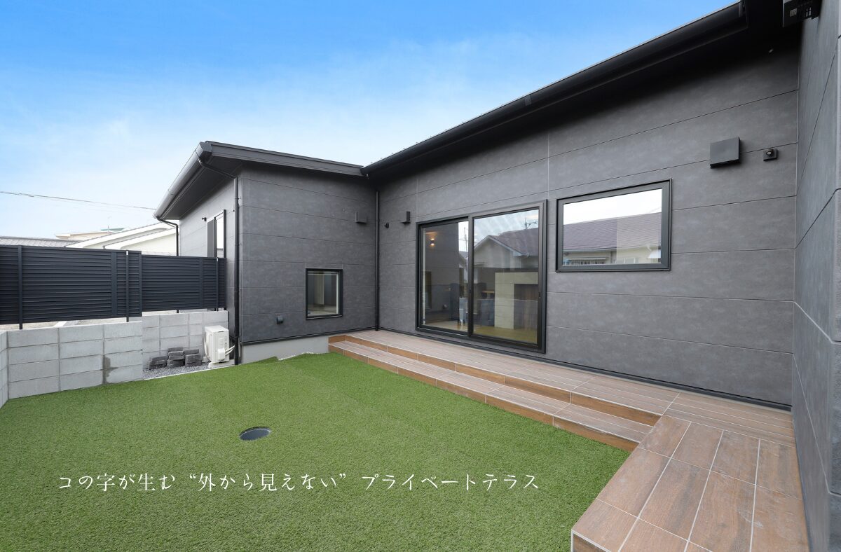 コの字型の中心に位置する庭は、外部からの視線が完全にシャットアウト。