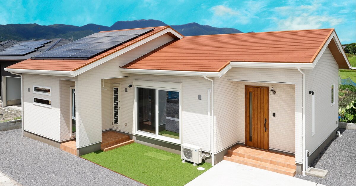 ① 白×テラコッタ屋根の“太陽光が似合うリゾート平屋”