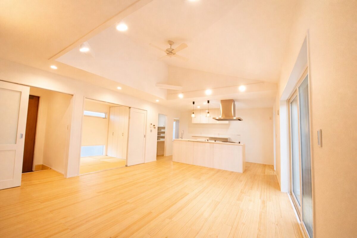 視線が抜ける勾配天井で、平屋とは思えない開放感。