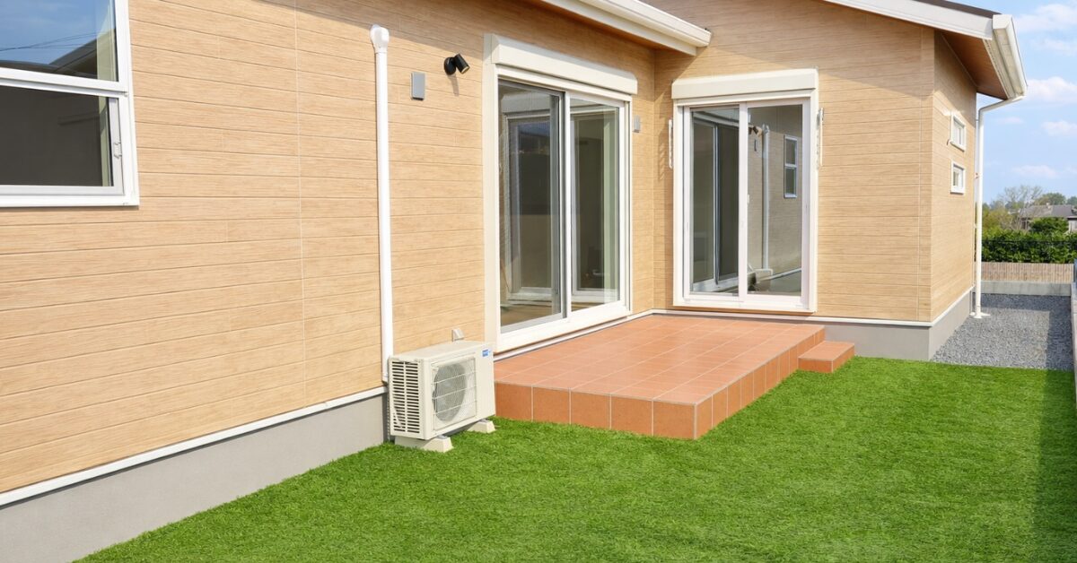 人工芝の庭で、子ども遊びも日向ぼっこも気軽に。