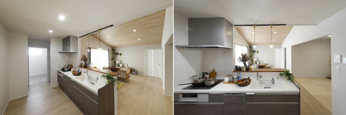 勾配天井が生み出す広がりのある空間。自然光が差し込むリビングは、家族が集まる心地いい場所に。