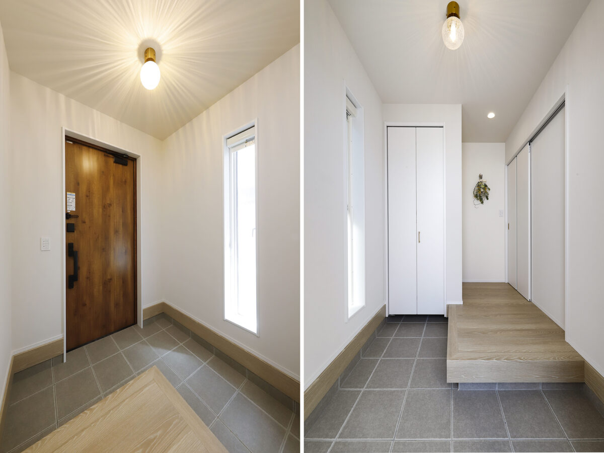 抜け感のある玄関形状に加えて、反射する光の模様が可愛い照明やスワッグを飾る面のクロスをベースより明るくして変化のある玄関となっています。