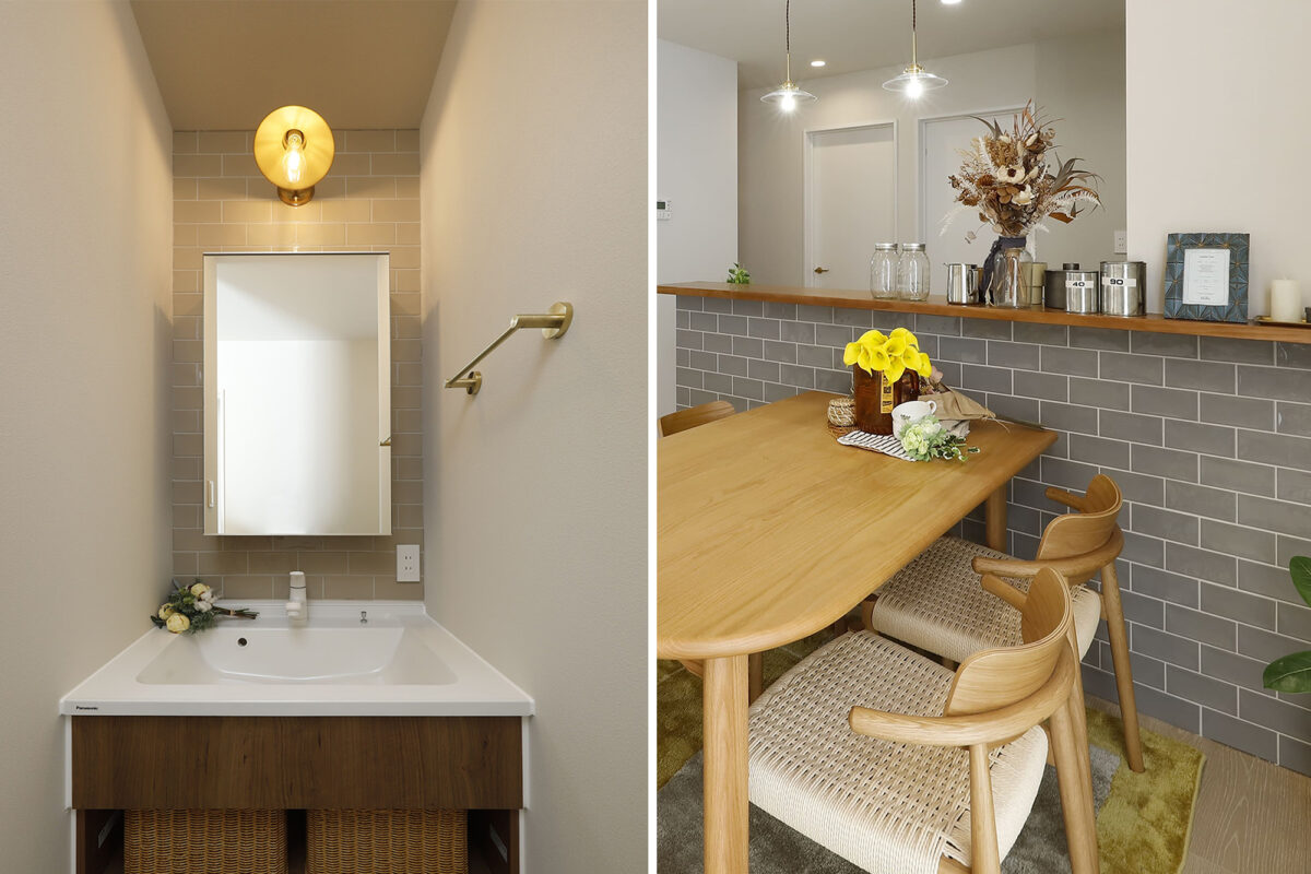 パナソニックの洗面台をベースに、タイルと照明で造作風に仕上げました。毎日使う場所だからこそ、見た目も使い勝手も大切に。