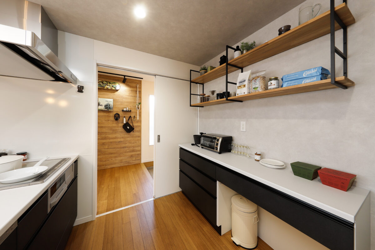 カッコよく収納力アップ!キッチン背面の見せる収納はウッドワンのカベツケ。