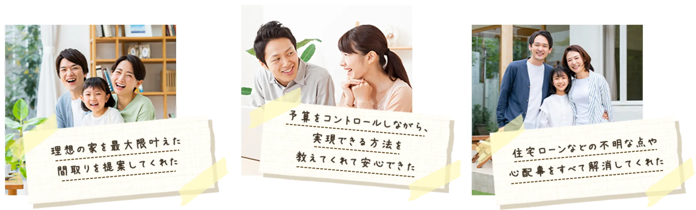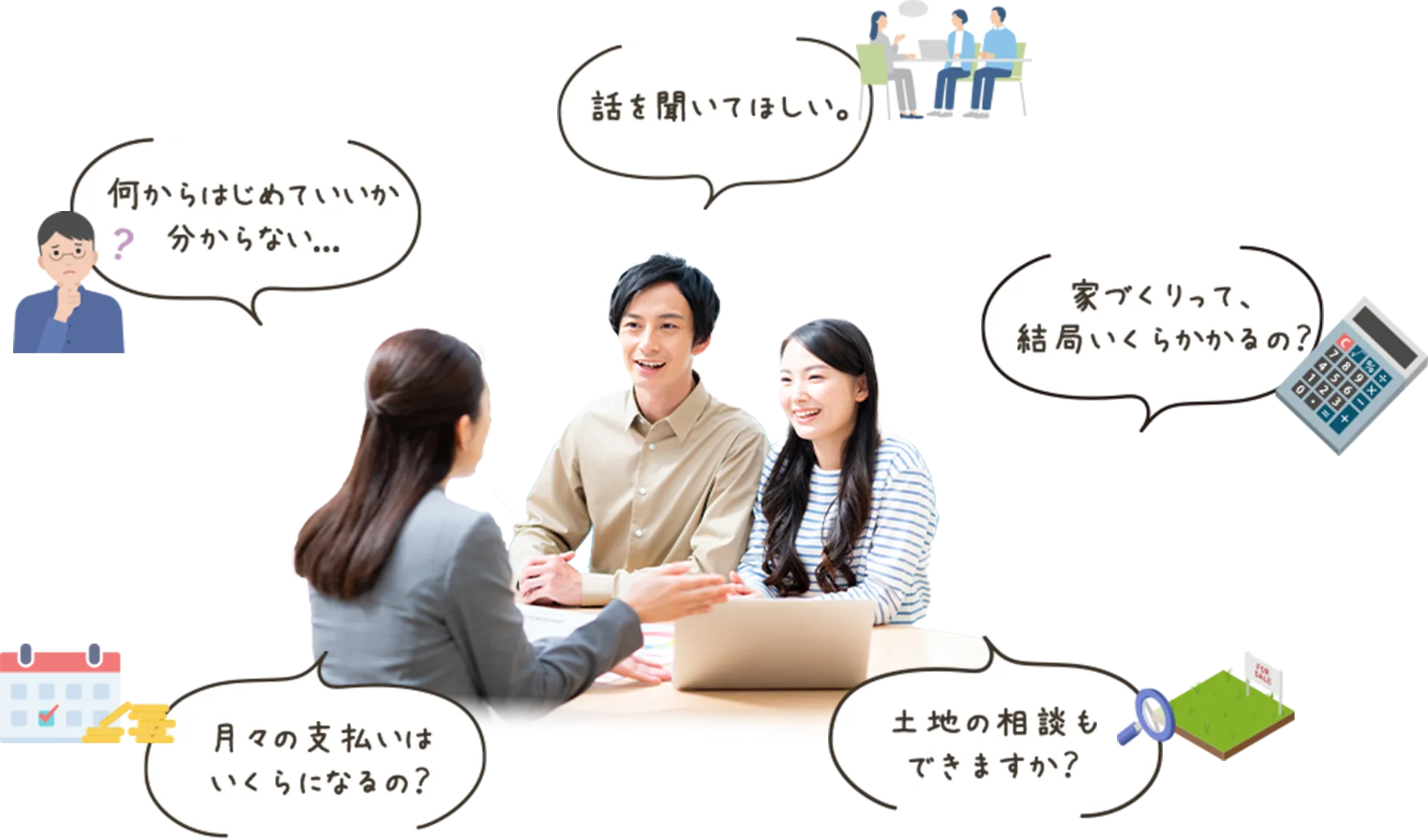 「この家はどのくらいの広さ?」「このプランでいくら?」などを実際にモデルハウスをご覧いただきながらご説明も可能です。お近くの店舗でご相談ください。
