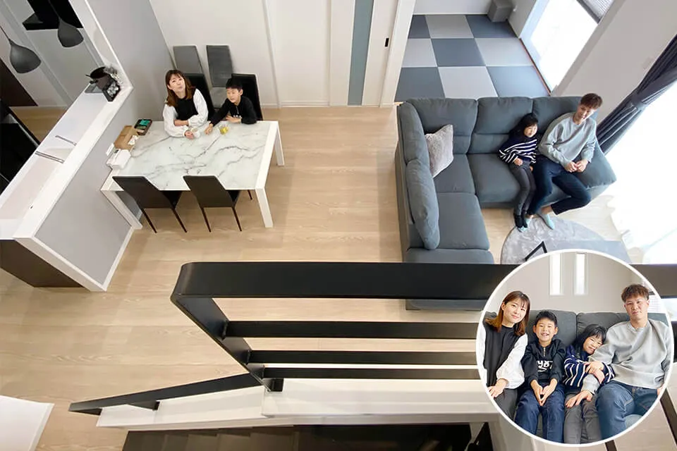 将来的に平屋がいいけど、子育て中は十分な部屋数と収納を確保したかったので、デザインや間取り、コストを比較して「中二階のある平屋」を選びました。リビングと床続きの大型収納のおかげで片付けが苦にならないですよ。中二階で遊ぶ子どもたちとの会話もスムーズでいつも一緒にいる感覚。この家にすごく満足しています。