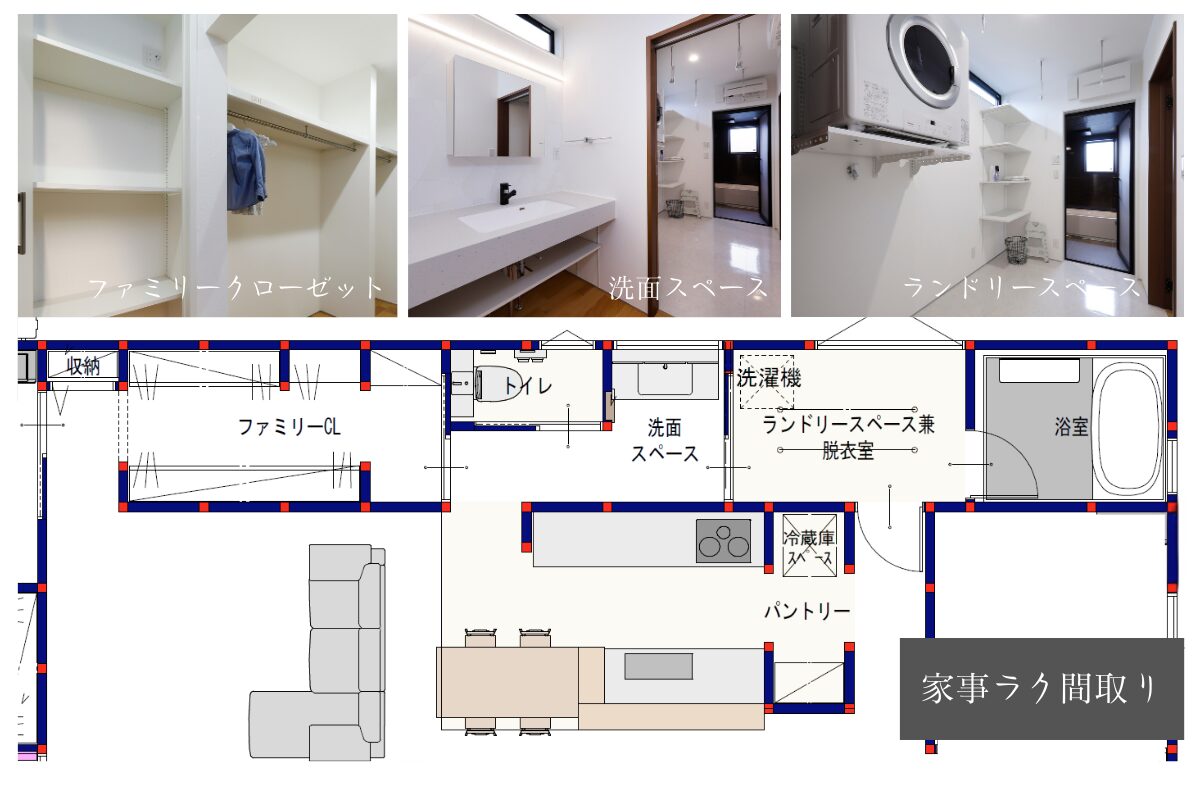 キッチンから洗面・ランドリー・WICまで一直線につながる家事ラク動線、