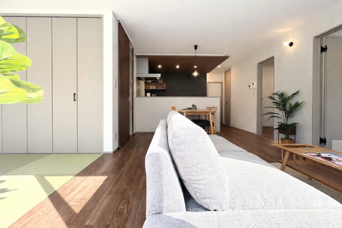 空間が緩やかにつながることで、視線が奥まで抜け、坪数以上に広く開放的に感じられるLDK。