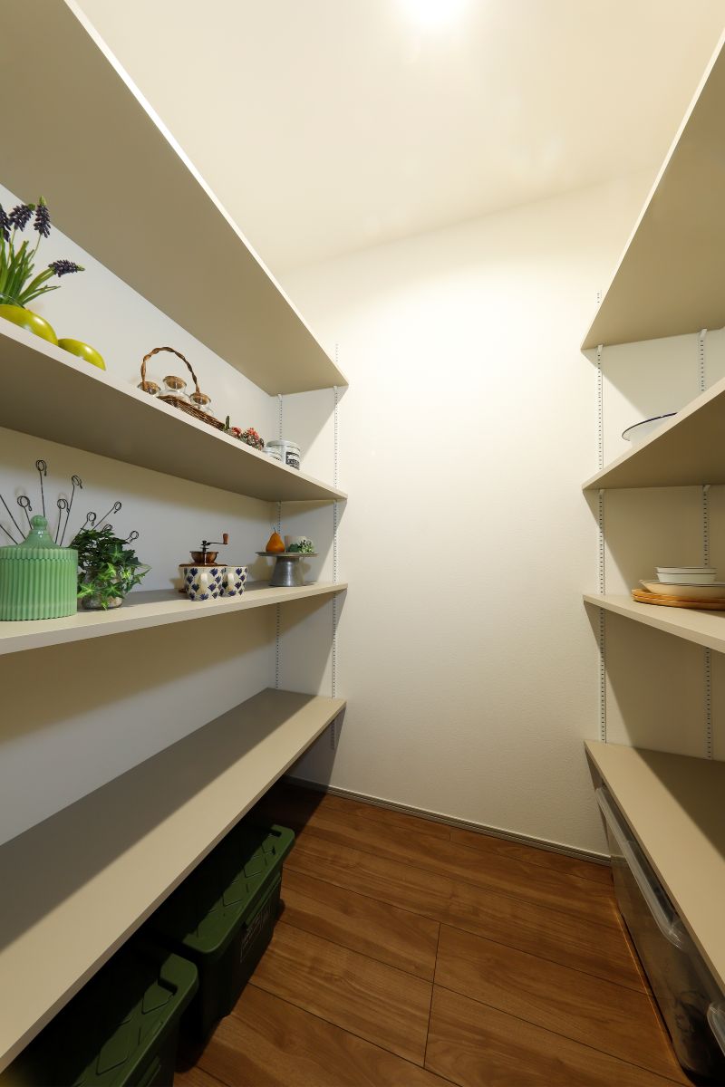 可動棚付きのパントリーは、食品や日用品をスッキリ収納。