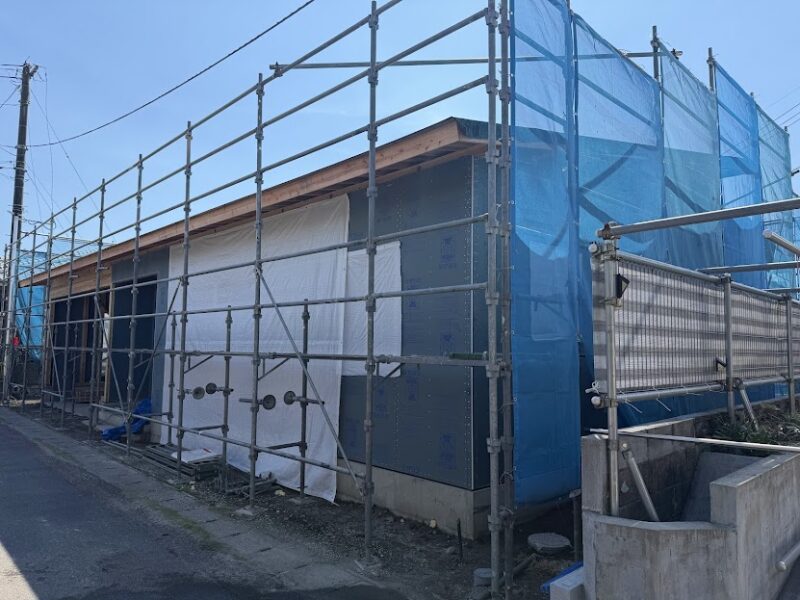外からみても、足場が組まれていて