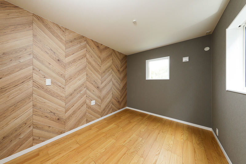 ヘリンボーンのアクセントクロスが、落ち着きのある空間に。寝る前の時間も心地よく過ごせます。