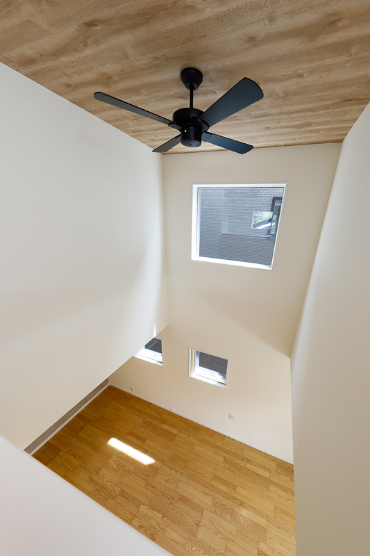 シーリングファンが空気をやさしく循環させ、木目天井が空間のアクセントに。時間の流れが少しゆるやかに感じられます。