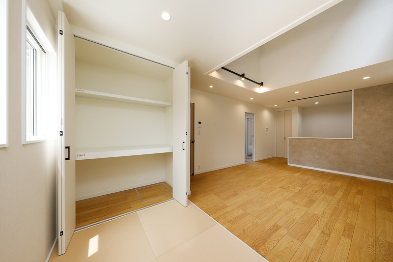 リビングとゆるやかにつながる和室は、お昼寝やちょっとひと息つく場所に。子どもの遊び場や来客時にも使える、あるとちょうどいい一室です。