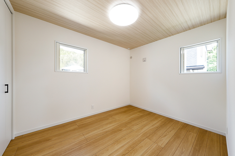 天井に木目調の壁紙を使い、明るく心地よい空間に。子ども部屋や寝室としても長く使えます。