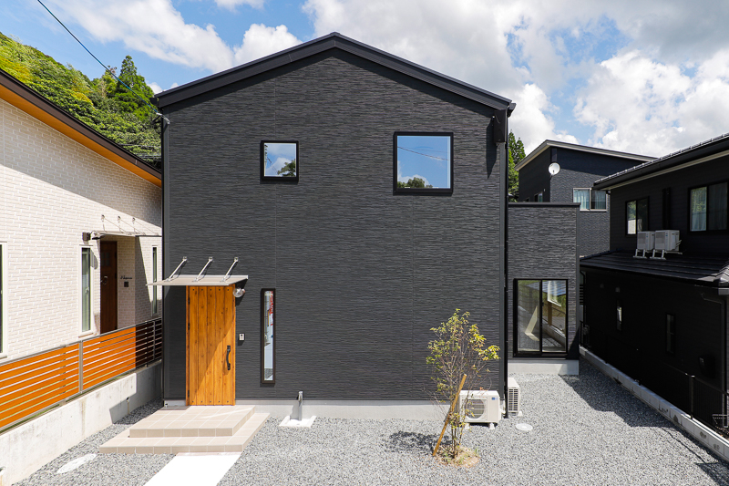 黒の三角屋根と木のドアがやさしく迎える佇まい。毎日の「ただいま」が少し楽しみになります。