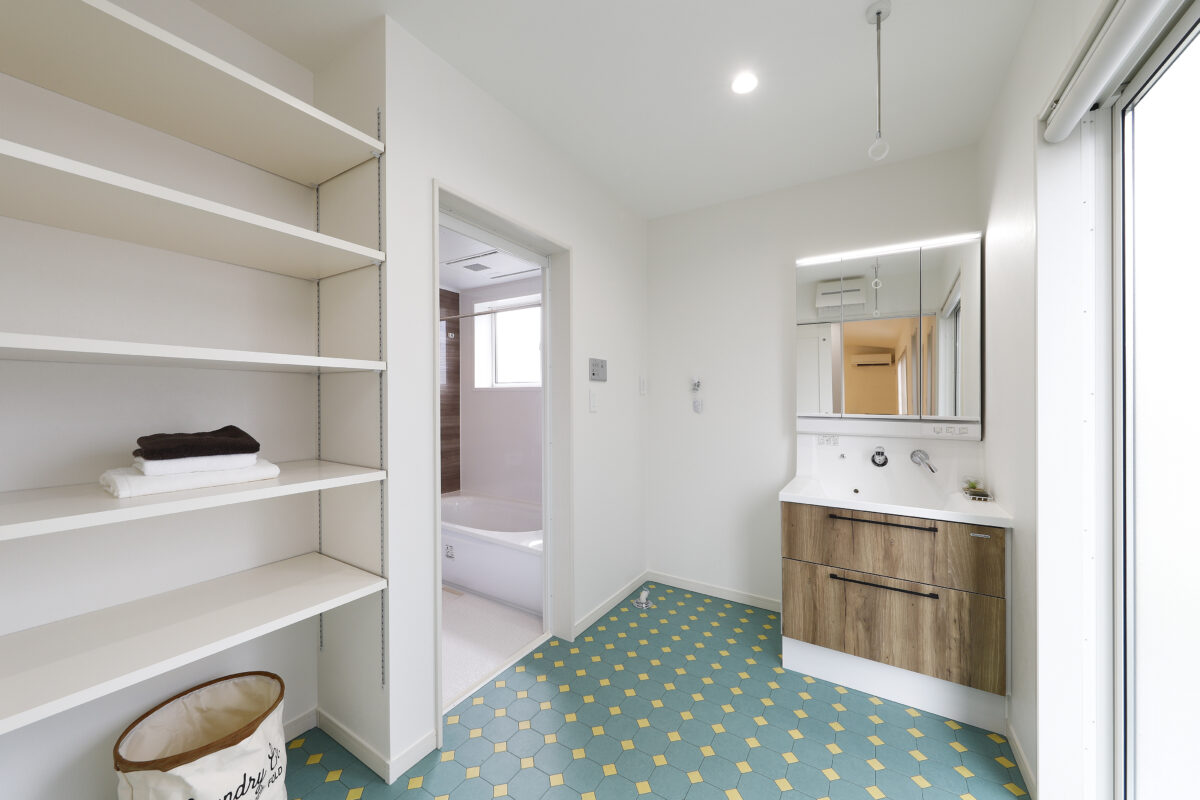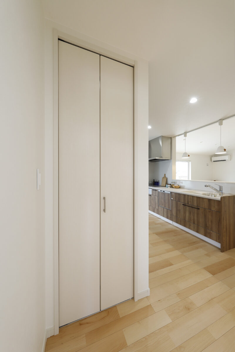キッチン裏にはパントリー、洗面脱衣室にはランドリースペースも兼ね備え、家事の動線にも配慮しています。