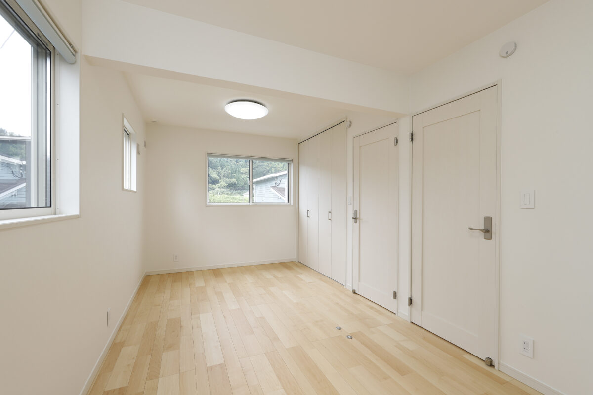 子ども部屋は将来の成長に合わせて間仕切り可能な可変性を確保。主寝室には収納を2つ配置し、スペースに余裕をもたせています。